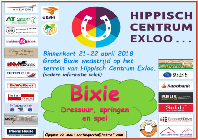 Grote Bixie wedstrijd 21-22 april 2018 ‹ Vorige Duurzaam Hippisch Centrum Exloo! Volgende › Internationale Men wedstrijd Exloo Gerelateerde berichten Topsport Dressuur Dressuur wedstrijd 13 en 14 april 2019 Showavond 20 december op HCE!! Binnenkort 21-22 april 2018, Grote Bixie wedstrijd op het terrein van Hippisch Centrum Exloo.