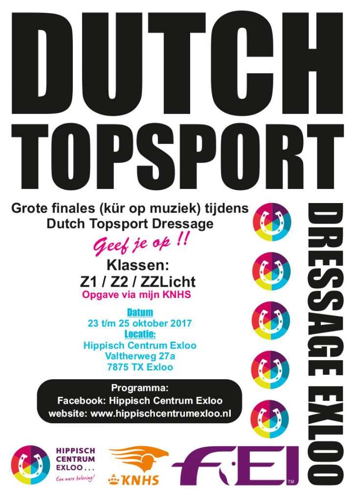 Nationaal Dressuur 23 t/m 25 oktober ‹ Vorige Internationaal Dressuur 26 t/m 29 oktober Volgende › Chantal Regter wint met Enjoy Grote prijs Exloo Gerelateerde berichten Nederlands Kampioenschap Jeugd tijdens Hemelvaartsweekend in Exloo Voorbereidingen EK/WK mennen Exloo 2023 in volle gang Final Foal Auction Exloo gaat online veilen! 2020