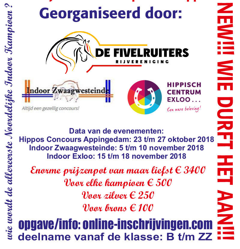 NIK Competitie ‹ Vorige Noord-Nederland vandaag goed voor vier van de zes gouden plakken tijdens het internationale toernooi IJslandse Paarden in Exloo Volgende › Jumping Indoor Exloo Gerelateerde berichten Dressuur wedstrijd 13 en 14 april 2019 Final Foal Auction Exloo gaat online veilen! 2020 CDI van 5 - 9 mei 2021 gaat door!