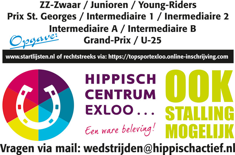 Subtop Exloo 10 november 2020 ‹ Vorige Dressuur wedstrijd 20 en 21 juli 2019 Volgende › Jumping Indoor Exloo 2020 Gerelateerde berichten Veterinaire keuring EK&WK mennen: 2 paarden voor herkeuring Dressuur wedstrijd 20 en 21 juli 2019 Topsport Exloo 14 en 15 augustus 2021